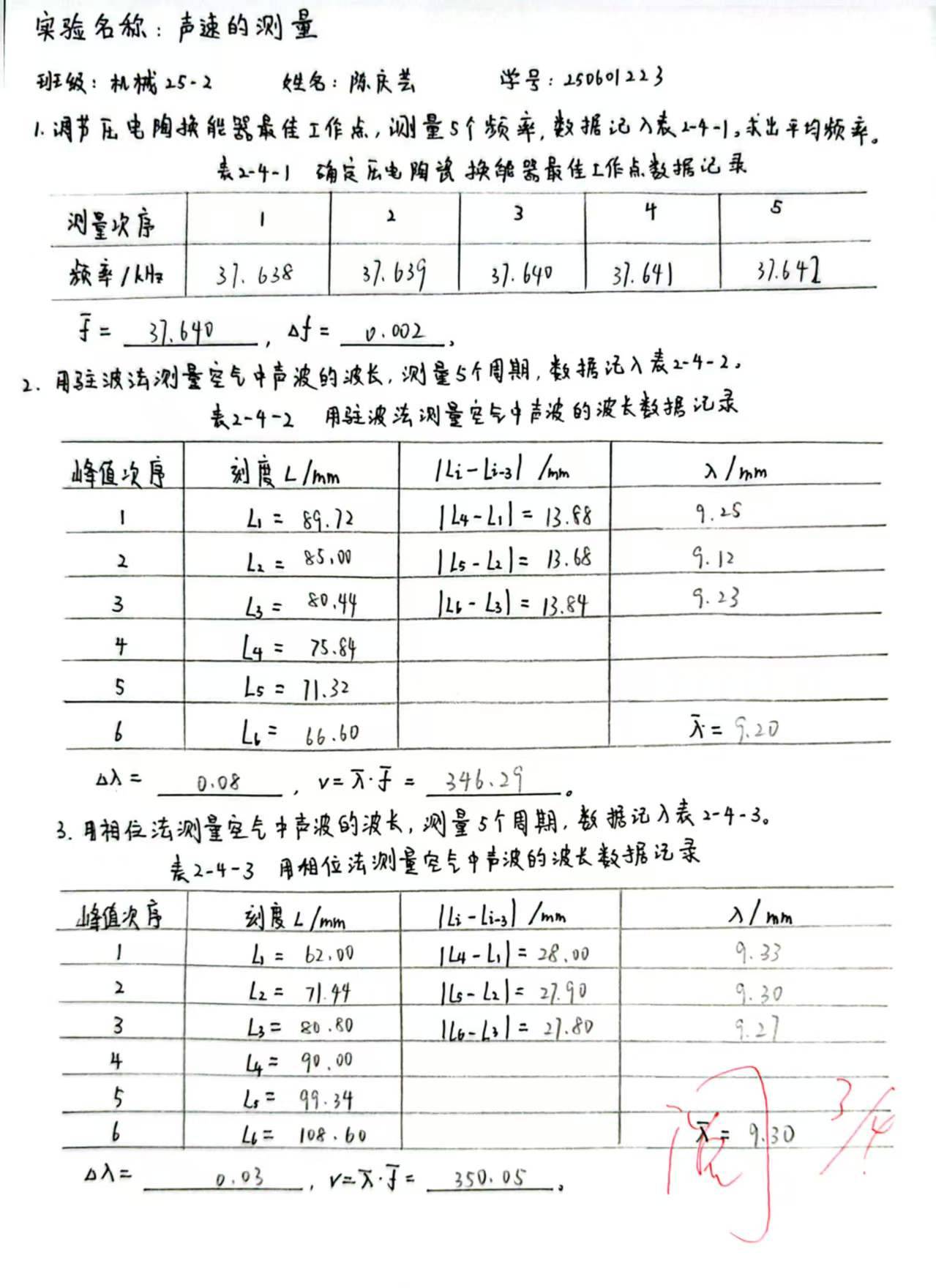 2.用驻波法测量空气中声波的波长,测量5个周期,数据计入表2-4-2。