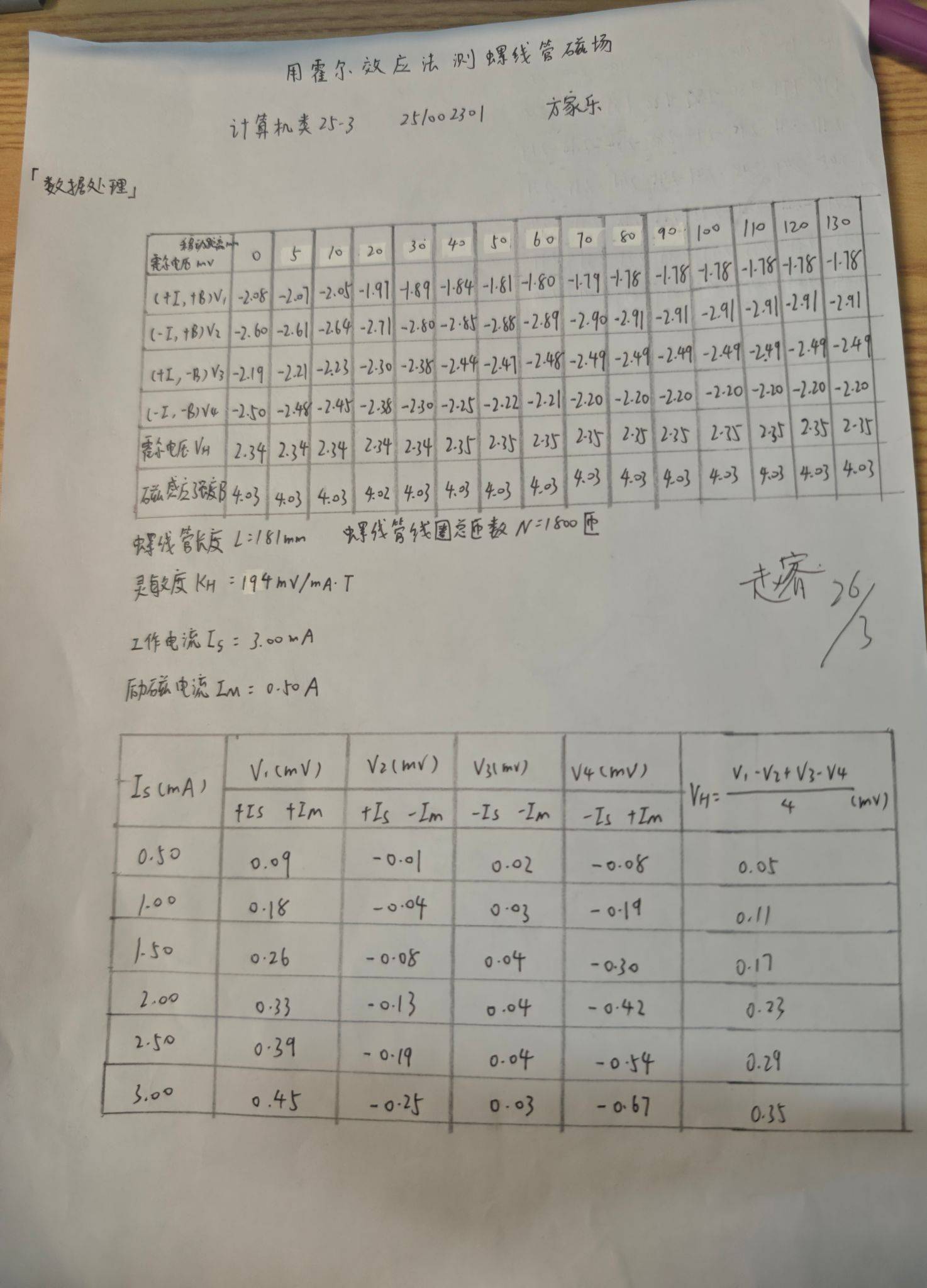 灵敏度KH=(1)mv/mA.T 螺线管长度L=181mm