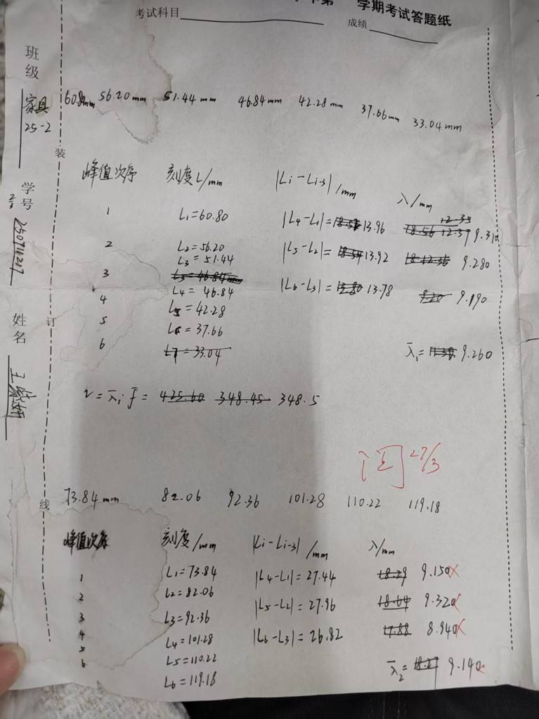 2.用驻波法测量空气中声波的波长,测量5个周期,数据计入表2-4-2。