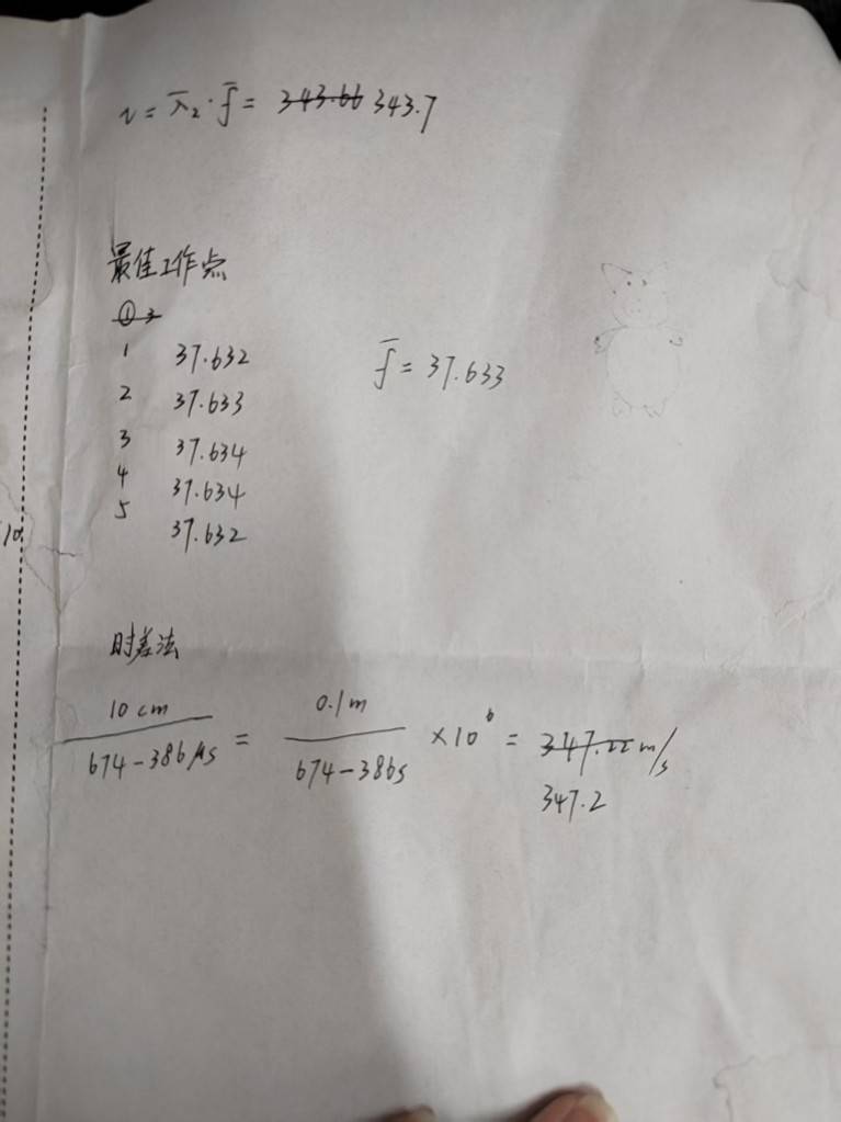1.调节压电陶瓷换能器的最佳工作点,测量5个频率(共振频率),数据计入表2-4-1。求出平均频率。